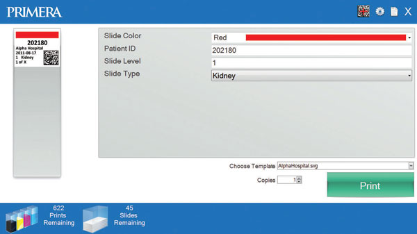 为用户提供多种载玻片标签设计模板,支持固定信息和可变数据,可变条形码打印。用户也可自行灵活设计模板。同时系统支持直接通过扫描二维码方式,例如扫描样品瓶、实验容器、包埋盒上的二维码,可自动将信息打印到载玻片上。