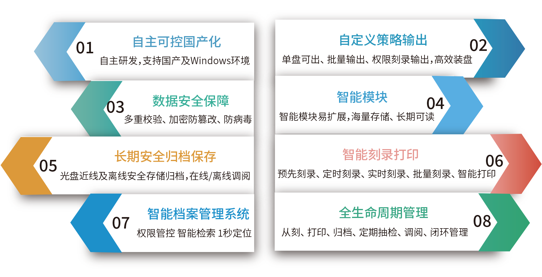 根据目前市场上无论是党政单位、档案行业、公采行业、公检法纪及军工涉密等保密行业均需满足档案长期保存归档的要求。依据档案政策法规相关要求,符合电子档案长期安全管理要求的存储介质,主要有磁介质、光介质、缩微胶片三种。所以现在各单位在选择离线方式中需要用到光介质。那么如何选择既能实现海量存储、高效管理,又能确保档案数据长期安全稳定保存策略呢?成为当前亟待解决的关键问题。